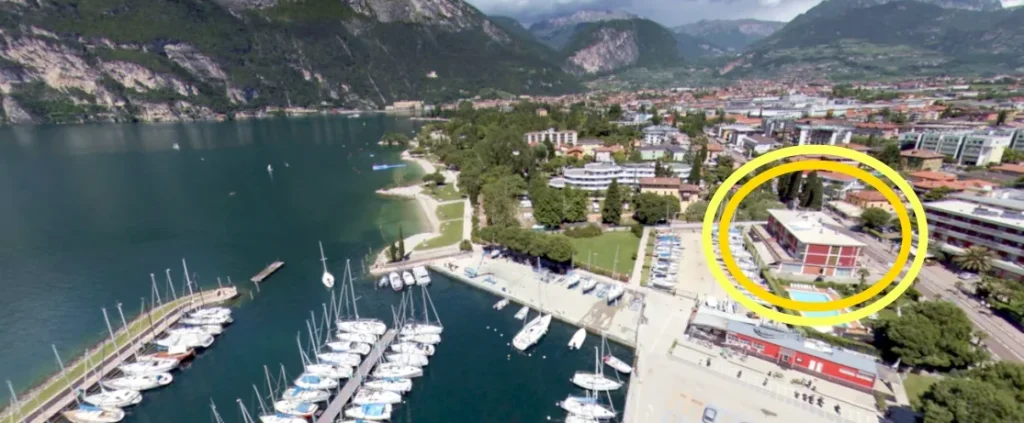 Diese zweistöckige Residenz liegt nur 200 Meter vom Strand entfernt und in Gehweite des Einkaufszentrums und zahlreicher Restaurants. Die Fußgängerbrücke entlang des Strandes führt in das historische Zentrum von Riva del Garda. Es ist ein lebendiger Ort, ideal für einen aktiven Urlaub.
